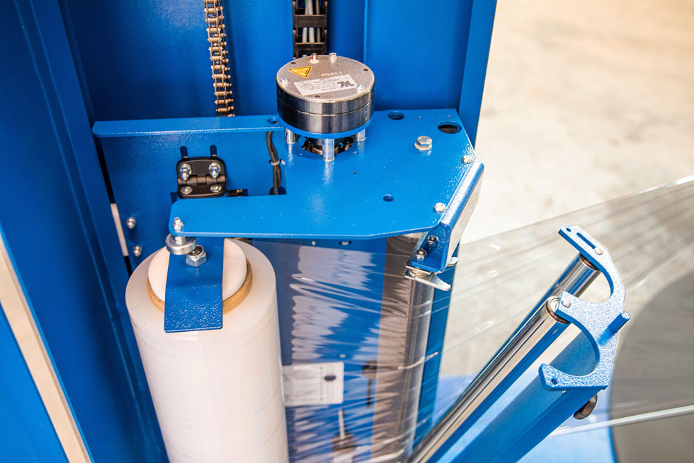 Eine wartungs- und verschleißfreie Magnetpulverbremse sorgt für die Dehnung der Stretchfolie zwischen der gebremsten Rolle und der drehenden Palette.