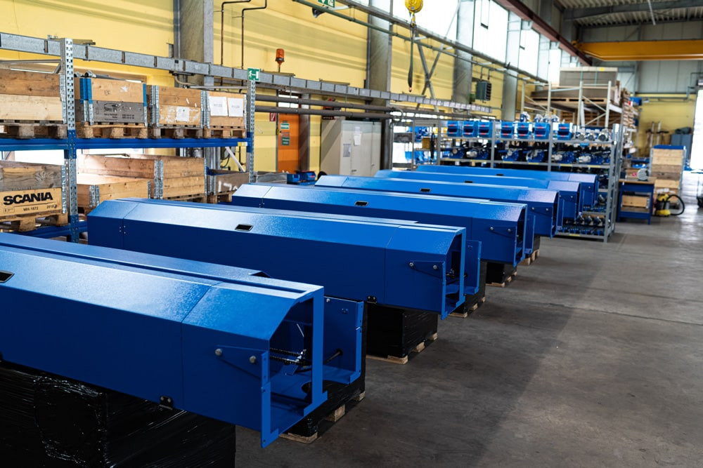 In unseren Produktionsräumen entstehen dann die halbautomatischen Stretchwickelmaschinen. Hier kommen alle Komponenten zusammen. Nach der vollständigen Montage und umfangreichen Funktions- und Qualitätsprüfungen verlässt die fertig verpackte Maschine unsere Produktion und wird an den Kunden versandt.